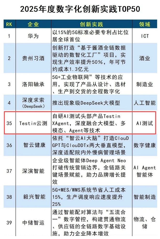 10月14日,由中国科学院主管的权威媒体《互联网周刊》正式揭晓“2025年度数字化创新实践TOP50”榜单。Testin云测凭借其创新的AI测试产品Testin XAgent,与华为、Deepseek、钉钉、中电金信、蘑菇车联、瑞为技术等行业领军企业共同获此殊荣。该评选涵盖人工智能、AI测试、智能制造、智能数据、金融科技等前沿领域,旨在全面评估国内企业在数字化浪潮中的技术创新成果与实践价值,为各行业的核心业务数智化升级提供权威指引与前瞻洞察。